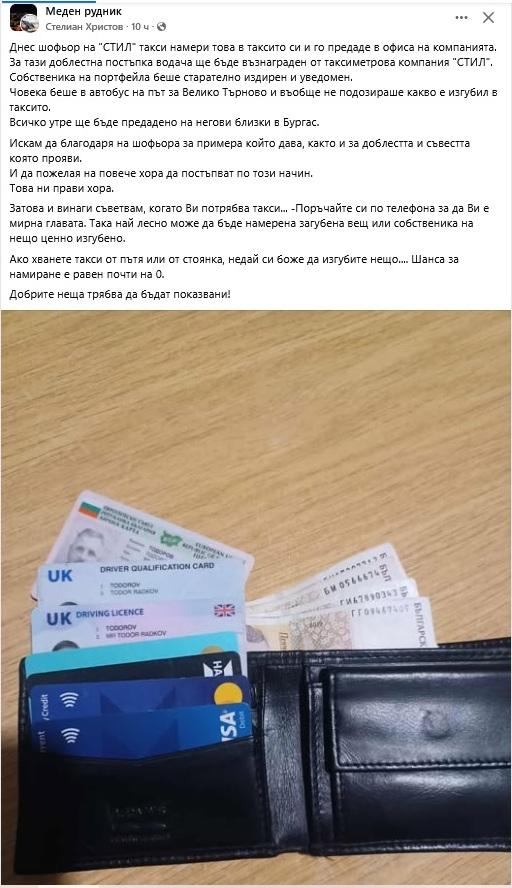 Шофьор на такси в Бургас може да послужи за пример. Той е намерил в колата си загубен портфейл, пълен с пари и документи, който е предал в офиса на компанията. Собственикът е намерен и портфейлът ще му бъде върнат. Ето какво написа за случката Стелиан христов във Фейсбук групата „Меден рудник“: